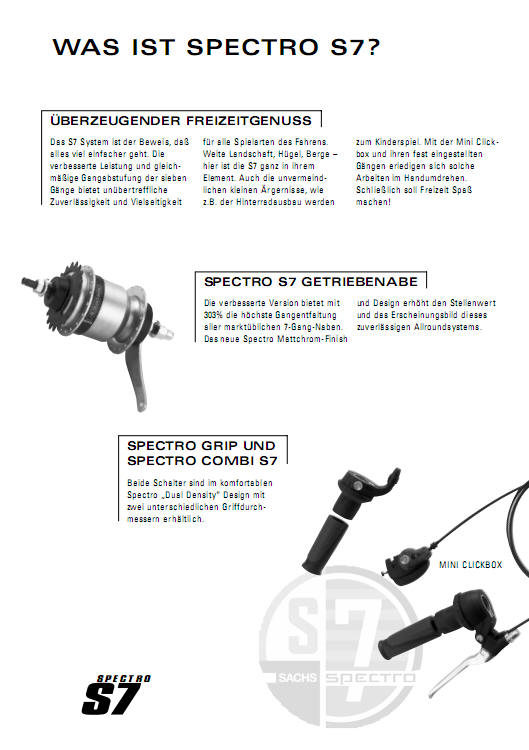 Die 7-Gang-Nabe Super 7 (H7213 mit Rücktritt) wurde aus der 5-Gang-Nabe Pentasport weiterentwickelt und kam 1993 in die Produktion. Die noch von Sachs entwickelte Super 7 besaß zunächst einen Übersetzungsbereich von 284 %, später wurde der Übersetzungsbereich von SRAM auf 303 % erhöht, die Übersetzungsverhältnisse sind: 1. Gang 1:0,574 – 2. Gang 1:0,677 – 3. Gang 1:0,809 – 4. Gang 1:1 – 5. Gang 1:1,236 – 6. Gang 1:1,476 – 7. Gang 1:1,742[3]. Die Nabe wurde zunächst als Spectro S7 verkauft, die aktuelle Bezeichnung lautet SRAM S7. Verändert wurde die Übersetzung des Planetenradgetriebes und die Ausführung der Bremse, der Aufbau der Nabe blieb ansonsten gleich. Die Super 7 / SRAM S7 besitzt in ihrem Inneren ein Planetengetriebe mit drei Sonnenrädern, einen Planetenradträger mit drei Planetenradsätzen und einem Hohlrad. Jeweils ein Gang wird von einem Sonnenrad und dem zugehörigen Planetenradsatz angetrieben, nur das geschaltete Sonnenrad steht fest, die anderen zwei können sich mitdrehen. Betätigt wird die Schaltung über zwei in die Achse eingeführte Stifte, die ihrerseits von einer auf die Achse geschobenen Schaltbox angesteuert werden. Mit den zuvor beschriebenen Naben hat die Super 7 / SRAM S7 das Achsgewinde (Steigung/Durchmesser) gemein; somit können Achsmuttern und die zur Aufnahme des Drehmomentes notwendigen Unterlegscheiben untereinander ausgetauscht werden. Das gleiche gilt für das Ritzel. Eine weitere Gemeinsamkeit findet sich im Inneren der Nabe in der Anordnung der Sperrklinken, die seit der Entwicklung des Modells 55 unverändert geblieben ist. Die Nabe wird in Deutschland vornehmlich mit einer Rücktrittbremse kombiniert, hergestellt werden jedoch auch Naben mit Trommelbremsen und Naben ohne Bremse. Geschaltet wurde die Nabe ursprünglich über einen Daumen-Lenkerschalter mit starrem Schaltdraht, später wurde ein Drehgriffschalter mit Schaltseil (Schaltzüge für Kettenschaltung passen) eingeführt. Ältere Super 7 können durch Austausch der kompletten Drehgriffschalter-Klickbox-Einheit von Daumenschalter auf Drehgriff umgerüstet werden. Dies ist zu empfehlen, wenn der Schaltdraht beschädigt ist, da es für diesen keinen Ersatz mehr gibt. Für den korrekten Zusammenbau der demontierten Nabe gibt es ein Spezialwerkzeug, mit dem die Planetenräder ausgerichtet werden.